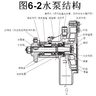 水泵進水管通過軟管與散熱器下水室連通,冷卻液直接進入水泵腔室的中央部位。在水泵中央部位安裝有管接頭,通過旁通管與節(jié)溫器副閥門連通。從副閥門流出的冷卻液通過該管接頭直接進入水泵腔室。水泵腔室后側(cè)用泵蓋封閉,泵蓋上的出水口正對水泵泵腔的出水室。將水泵固定于發(fā)動機后,泵蓋上的出水口與水套的分水管進水口對接。在泵殼的油封與軸承座孔之間設(shè)有泄水孔,當水封有少量的水滴泄漏時,可以從該孔泄出。若當發(fā)動機熄火后仍然有水泄出,則應(yīng)拆開水泵進行修理。