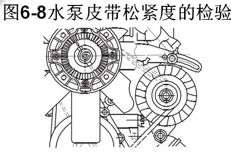 應(yīng)經(jīng)常檢查皮帶的松緊度,防止由于皮帶打滑而使水泵工作不良。如圖6-8所示,用手以9-29 N的力在皮帶中部按下,皮帶的下移量應(yīng)以3-6 mm為宜。