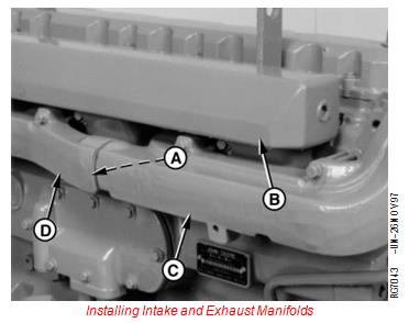 4. Install exhaust manifold assembly using new gaskets and guide studs. Tighten cap screws to specifications.
