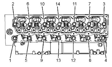 用干用干凈的發(fā)動機(jī)機(jī)油潤滑螺紋和螺栓頭的下部。 按圖 14 中所示的順序?qū)⒙菟ㄉ暇o到以下扭矩。50 N•m (37 lb ft)再次將螺栓擰緊至以下扭矩。160 N•m(118 lb ft)將螺栓頭擰緊到附加量。130 度